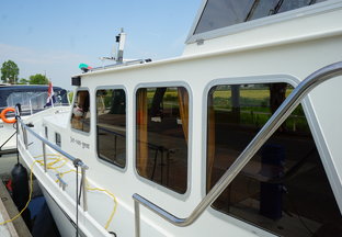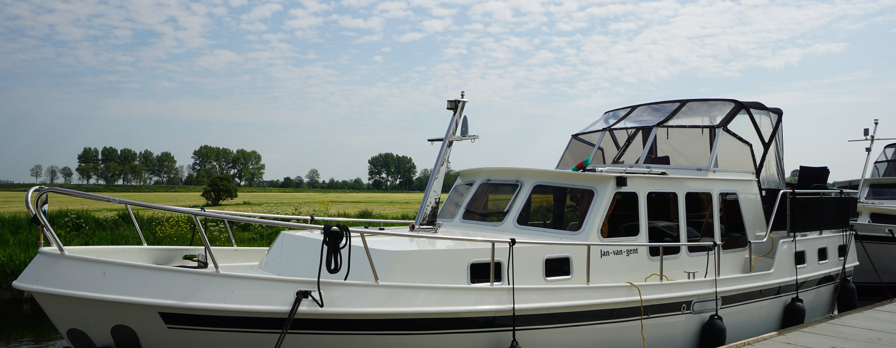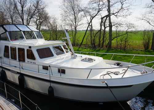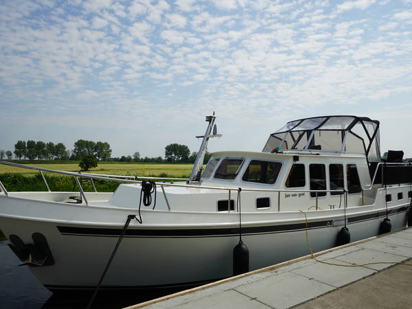 De motorkruiser Jan van Gent is een stoer schip met een achterhut en cabriokap, voorzien van een boegschroef en een handig iPad GPS-navigatiesysteem.